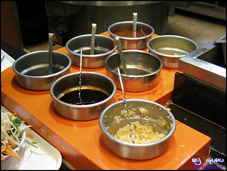 4. 그다음에 점원한테 주면.. 소스를 7가지 뿌려줍니다. 고추기름,레몬,마늘다진거,파인애플등 몇개는 기억안남.